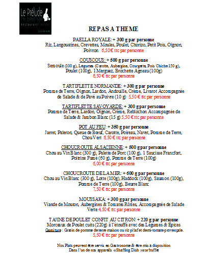 Repas à thèmePAELLA : + 300 g par personne 7.50 € ttc par personne MACARONADE : + 500 g par personne 7.50 € ttc par personne Aligot, saucisse aveyronnaise cuite au four avec tomate, oignons et vin blanc SAUCISSE TRUFFADE : +500 g personne 7.00€ par personne Truffade (pommes de terre et filé à la tomme fraîche, saucisse cuite au four avec tomate, oignons et vin blanc